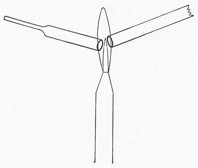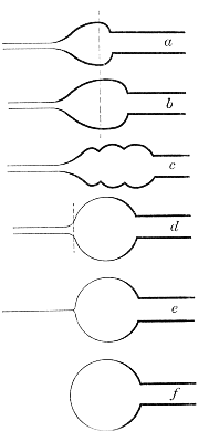 When tubing of large diameter or thin wall is to be cut, it is often better not to attempt to break it in the usual way, but to heat a very small globule of glass (1⁄16 to 1⁄8 inch diameter) to red heat, and touch it to the scratch. This will usually start the crack around the tube; if it has not proceeded far enough, or has not gone in the de[Pg 8]sired direction, it may be led along with a hot point of glass. This is put a little beyond the end of the crack, and as the latter grows out toward it, moved along the path where the crack is desired. This point of glass is also very useful in breaking off very short ends of tubes, where there is not room to get a firm enough hold and sufficient leverage to break the tube in the ordinary way, and for breaking tubes attached to large or heavy objects, which would be likely to make trouble if treated in the ordinary way.
