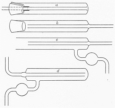 Tubes which have been evacuated usually are sealed off while they are still connected to the vacuum pump. The connection should be through a small, rather thick-walled tube. When this is to be sealed, it is slowly heated toward the softening point. As the glass just begins to soften, the air-pressure will force it in, and care must be taken that the softening is uniform over the whole circumference of the tube. As the shrinking goes on, the tube is gently drawn out to make a thick-walled cone at that place, and the end is drawn off as soon as the tube is sealed. The principal point to be guarded is the thickness of the walls of the cone, and uniform heating. A thin place or a hot place will give way under the air-pressure and be sucked into the tube.