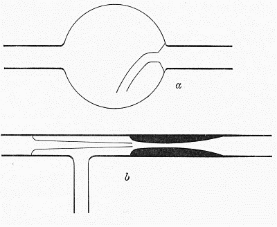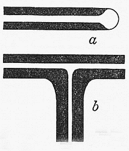 Constricting a Tube.—Where a constriction is to be made in a tube, the above method must be modified, as the strength of the tube must be maintained, and the constricted portion is usually short. Small tubes are often constricted without materially changing their outside diameter, by a process of thickening the walls. The tube is heated before the blast lamp, rotating it about its axis as later described, and as it softens is gradually pushed together so as to thicken the walls at the heated point, as in a, Fig. 1. When this operation has proceeded far enough, the tube is removed from the flame, and the ends cautiously and gently drawn apart, continuing the rotation of the tube about its axis and taking care not to draw too rapidly at first. The resulting tube should have a uniform exterior diameter, as shown in b, Fig. 1.