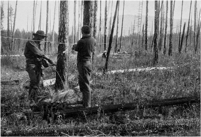 The building and maintenance of trails, telephone lines, roads, bridges, and fences in his District is under the charge of the Ranger, and in many cases Rangers and Forest Guards are appointed by the State as Wardens to see to it that the game and fish laws are properly enforced.