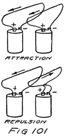 The reason is that all these things are made of little specks, too tiny ever to see, which we might call specks of electricity. There are only two kinds of specks and we had better give them their right names at once to save time. One kind of speck is called “electron” and the other kind “proton.” How do they differ? They probably differ in size but we don’t yet know so very much about their sizes. They differ in laziness a great deal. One is about 1845 times as lazy as the other. That is, it has eighteen hundred and forty-five times as much inertia as the other. It is harder to get it started but it is just as much harder to get it to stop after it is once started or to change its direction and go a different direction. The proton has the larger inertia. It is the electron which is the easier to start or stop.