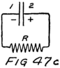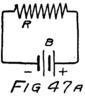 It’s these wandering electrons which are affected when a battery is connected to a copper wire. Every single electron which is away from its home group, and wandering around, is sent scampering along toward the end of the wire which is connected to the positive plate or terminal of the battery and away from the negative plate. That’s what the battery does to them for being away from home; it drives them along the wire. There’s a regular stream or procession of them from the negative end of the wire toward the positive. When we have a stream of electrons like this we say we have a current of electricity.