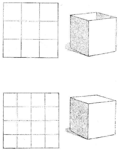 Mould a square prism of clay. Draw it standing on a square face. Draw it lying on an oblong face.