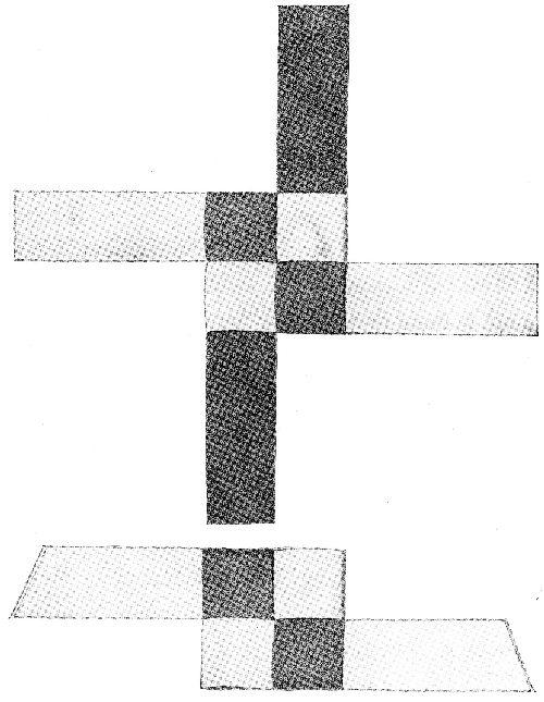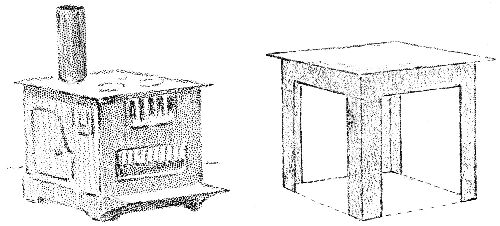 Make a solid cube of stiff black paper. Cut pieces for doors, covers, grate, hearth and pipe. Paste them on. The bottom is a very low box with a little larger face than the cube. Make one. If you like, cut out the sides to leave wide legs. Paste the bottom of the stove on this base.[Pg 66]