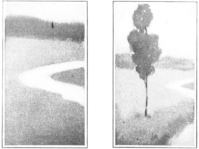 Sketches 1 and 2 show you how different the same design appears, when painted in different keys. Sketch 3 is a landscape in the same values used in Sketch 1. Sketch 4 shows the same scene in a lower key. The soft, silvery light of early morning has given place to the deeper tones of dusk.