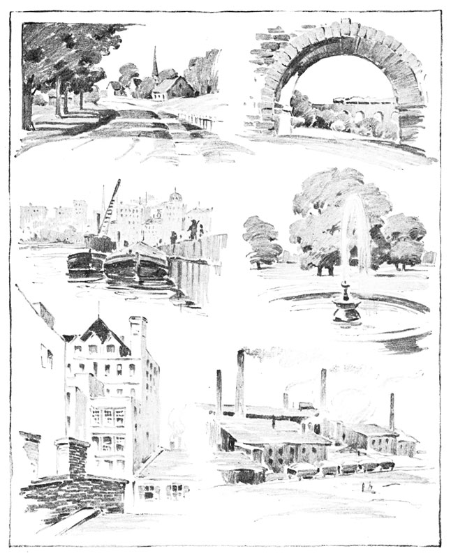 Some Leaves from a Sketch-book. Look at the sketches on page 13. They are leaves from an artist's sketch-book. He tells of a shady road winding by a little church in a village; of freight-boats on a canal or river; of a view from a high window in a city office building; of a fine stone arch, and beyond it a bridge with a railroad train rushing across it; of a fountain in a city park, and of a grimy, noisy factory, with its long low roofs, its smoke-stacks, and its line of waiting cars. Have you thought of looking for pictures in places like these?