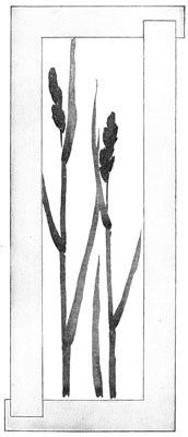 You will enjoy brush drawings, using color or ink, of different kinds of grasses. Select three or four of large size and place them in a bottle. They will then fall gracefully into a natural position. Behind the bottle place a tall background of some kind, so that the shapes of the grasses will be clearly seen. Use paper large enough to show in life size the grass heads and part of the leaves and stems. Before beginning the study, practice drawing grass leaves with one stroke of the brush, without first outlining their shapes. Then draw from the arrangement before you, working freely with the brush. In studying the leaves, notice where the greatest width is seen. Observe the size and direction of the stems, and draw them so that they express the upright growth and the grace of the plant. Grass stems are not like the stems of flowering plants or vines. Try to see and express the difference.