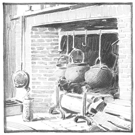 If you look on page 4 you will see three little pictures that seem quite complete in themselves, and yet look like parts of the picture on page 2. The upper sketch shows the same big tree by the stream, and the lower right sketch has been taken from the left side of the large picture. A small part near the middle of the large picture was then selected, and this part was enlarged to make the third sketch shown.