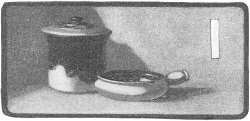 One way of adding to the interest and beauty of large and small spaces is to show them in values. Compare Sketches 1 and 2 on this page with Sketches 1 and 2 on page 81. You will find the plaids which are shown in values more interesting than those which are made with lines only. The two values in each sketch on this page are chosen from the neutral value scale on page 80. In Sketch 1, High Light (HL) and Black (B) are used, and in Sketch 2, we find Middle (M) and Black (B). You see how different in effect the two plaids are. The same difference can be shown in landscape, flowers, or in any other picture or design, by changing the values. Sketches 3 and 4 show simple groups of still life, first drawn in outline from the objects, and then painted in values chosen from the value scale. Sketch 3 is painted in the same values as the plaid in Sketch 1, and Sketches 2 and 4 are alike in values.