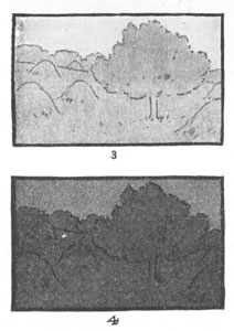 Expressing Colors in Neutral Values. On page 4 are "finder" pictures taken from the autumn scene on page 2. These are done in gray washes that correspond to the colors in the autumn sketch. The trees are shown in grays that make them just as dark as the trees in the colored picture. When we make gray washes just as light and as dark as colors that we wish to represent, we say that we express those colors in neutral values.