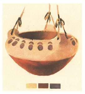 After drawing such a design, the next step is to make the bowl of clay. For the bowl represented here, a lump of clay was rolled and patted into a low, roughly shaped cylinder. The thumbs were then thrust into the middle of the cylinder, and they, together with the fingers, pushed the clay outward to form the bottom and part of the sides of the bowl. The sides were finished by adding flat pieces of clay, their edges being carefully worked until the pieces added seemed a part of the form. The sides and bottom of the bowl were kept of uniform thickness. Then the bowl was allowed to stand about a day, or until it became what is called "leather hard." The border was then painted on with potter's colors, the lower part of the bowl was colored, and the inside glazed. The bowl was again allowed to dry, this time very thoroughly. It was then fired in a potter's kiln.