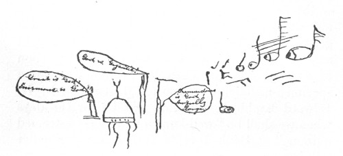 I feel too much disappointed to make any remarks. The harper poses his harp—a huge instrument—upon our doorstep, sets all the strings ringing with a sweep of his grimy fingers, clears his throat with a sort of angry growl, and begins,—