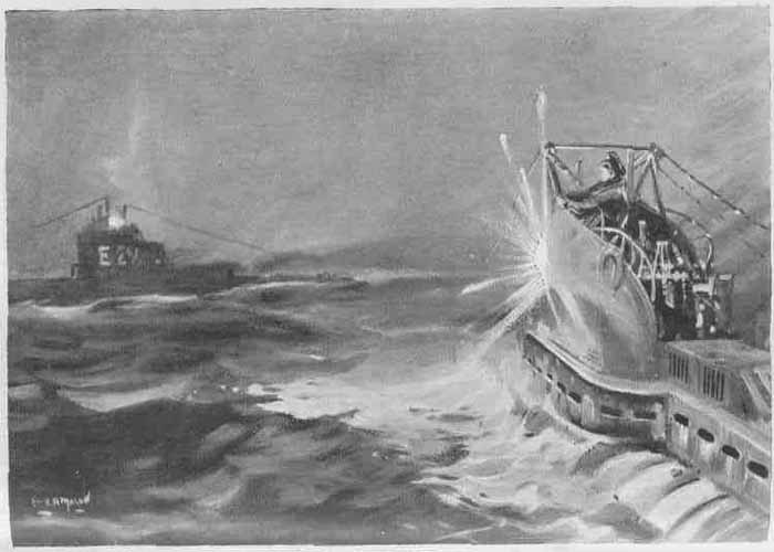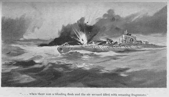 As I came down, the First Lieutenant was at the periscope, looking round the horizon. Quickly I thrust the youth from the eyepiece, and, as calmly as I could, said: "I thought I heard propellers."