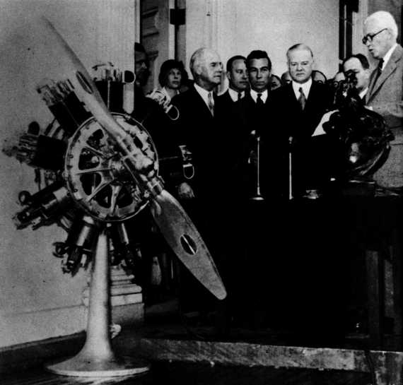 Frontispiece—President Herbert Hoover (in front of microphones) presenting the Collier Trophy to Alvan Macauley (nearest engine), President of the Packard Motor Car Co., on March 31, 1932 (although the award was for 1931). Also present were Hiram Bingham, U.S. Senator from Connecticut (nearest pillar), Clarence M. Young, Director of Aeronautics, U.S. Department of Commerce (between Macauley and Hoover), and Amelia Earhart, first woman to fly across the Atlantic Ocean (between Macauley and the engine). In the foreground is a cutaway Packard diesel aeronautical engine and directly in front of Senator Bingham is the Collier Trophy, America’s highest aviation award. (Smithsonian photo A48825.)