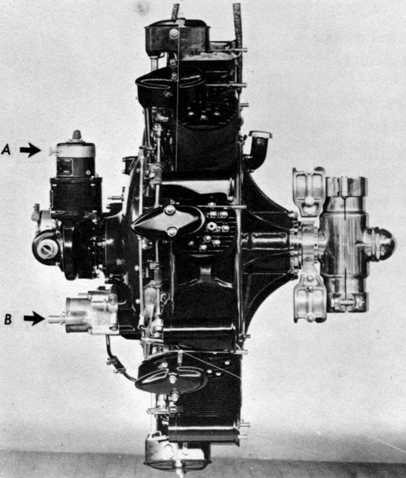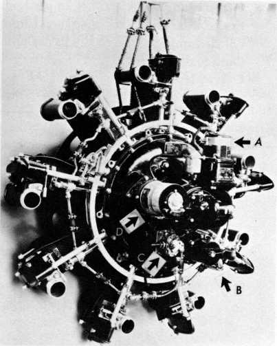 | Figure 19.—Right side view of engine, showing accessories; Packard Motor Car Co. 50-hour test, 1930. A, starter; B, oil filter. (Smithsonian photo A48323.) | Figure 20.—Rear left view of engine, showing accessories, U.S. Navy 50-hour test, 1931. Barrel valve type venturi throttles. A, starter; B, oil filter; C, fuel circulating pump; D, generator. (Smithsonian photo A48324C.) | |