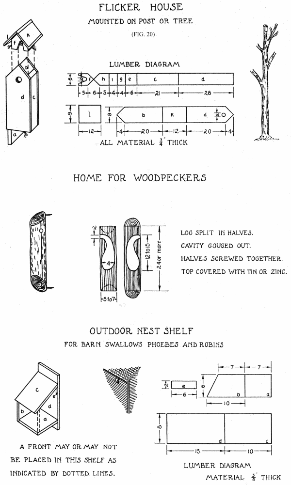 The flickers spend much of their time on the ground in search of ants which form the larger percentage of their food. Since ants sometimes cause considerable trouble for other birds, a pair of flickers are worth cultivating for the sake of the work[Pg 13] they can do. Artificial nesting boxes of sufficient depth and size are quite readily used, Figs. 6, 20 and 25.