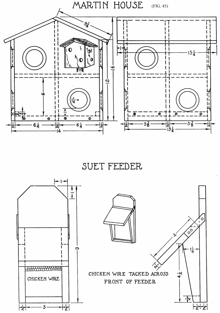 Nearly everyone knows swallows of one variety or another. The most beautiful of the family are the martins, Fig. 8. This bird is of great service against the inroads of wasps, bugs and beetles. It prefers to live in colonies even though the males fight bitterly at times. Martin houses should have at least several rooms, each separate from all the others. Houses have been built to accommodate fifty and more families. Smaller ones are shown in Figs. 8, 9, 13 and 45.