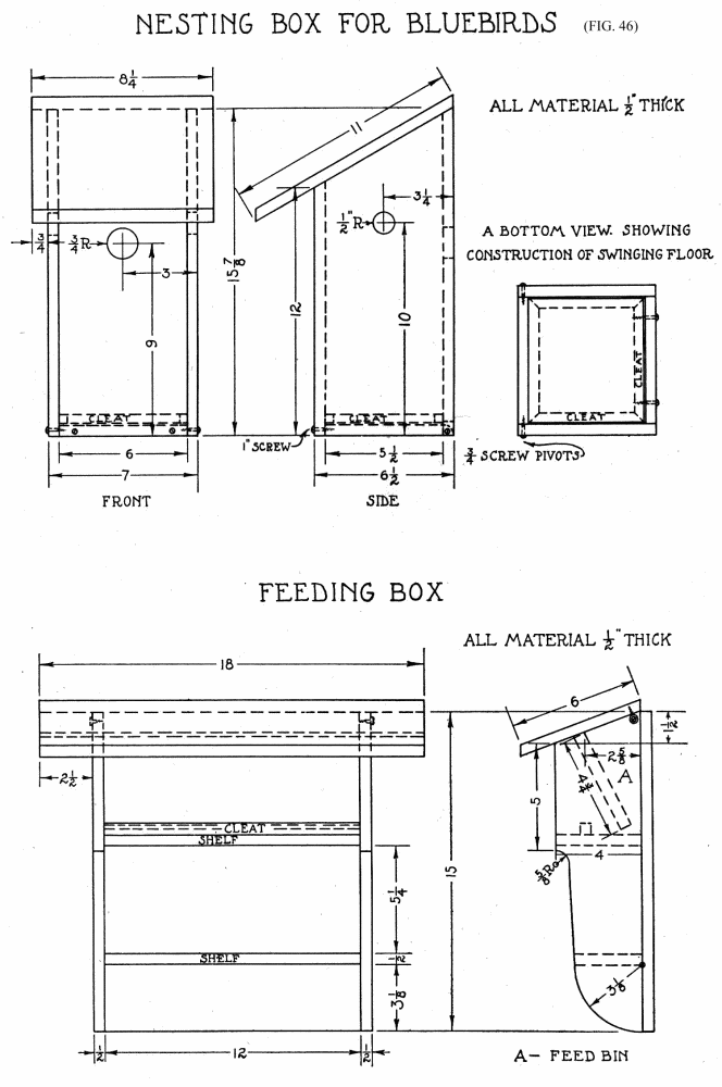 The boy with an outfit of tools at home, or with a teacher of manual training interested in birds, can make all of the houses to be described in this section. Figs. 10 and 11 show simple houses for wrens and bluebirds. Drawings for this type of house[Pg 17] are shown in Figs. 14, 15 and 21. While the surfaces of lumber used for these houses may or may not be planed, care must be taken that all pieces are sawed or planed to the correct sizes with edges and ends square and true so there will be no bad cracks for drafts and rain to enter. Be careful to nail the pieces together so that they will not have occasion to crack or warp. A good way to save time and lumber is to prepare a piece of stock, getting it of the right thickness, width and length, and then to saw up this stock on lines carefully laid out as shown in the drawings of the bluebird and wren houses, flicker nest, robin shelf and finch house. The most difficult houses to build are those for martins. In Fig. 45 is given a drawing for a small home arranged to care for eight families, while the photographs, Figs. 8, 9, 38, 66 and 67 show larger, finer and more difficult houses. The[Pg 18] doors or openings are 2-1/2" in diameter and can be made with an expansion bit or a key-hole saw. All of these houses are to be made so they may be cleaned. Sometimes the bottom is hinged on two screws or nails, and held in proper place by a dowel (bluebird house, Fig. 21); or screwed in place (wren house, Fig. 21, and martin house, Fig. 45); or hinged and held in place by a brass spring (wren house, Fig. 14).