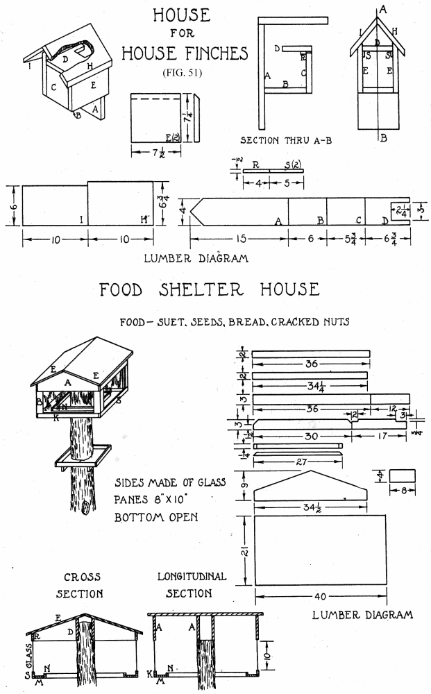 The house finch has made many enemies because of its fondness for cultivated fruits and berries. However, it has some[Pg 11] redeeming features in its song and beauty. The nest is usually placed in the fork of a limb—evergreens being favorite nesting places. The house shown in Fig. 51 is suitable for these birds but is also acceptable to wrens.