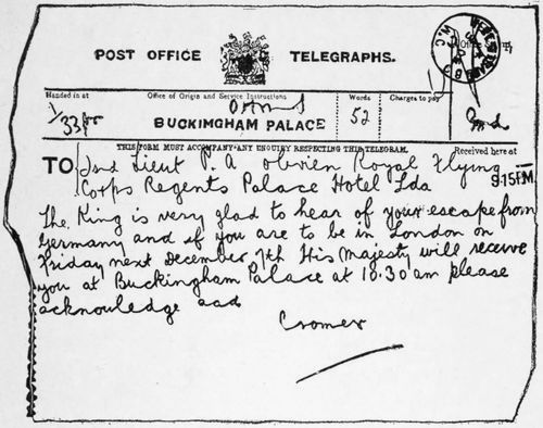 The King is very glad to hear of your escape from Germany. If you are to be in London on Friday next, December 7th, His Majesty will receive you at Buckingham Palace at 10:30 a.m. Please acknowledge.