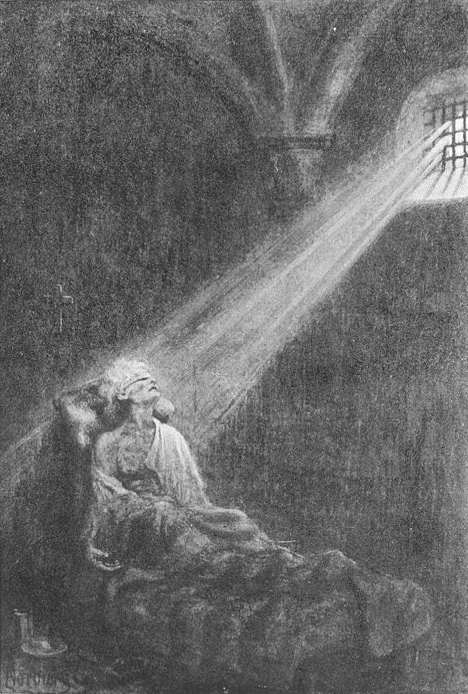 He looked round on the crowd of angry faces; from the shaggy beards close to him, to the shaggy beards against the walls, where men were mounted on tables and forms to see him over the heads of others: and he knew that his time was come.