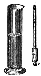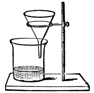 To prepare the albumen, procure a sufficient number of eggs, remembering that the white of a large egg will be about a fluid ounce; have a cup to collect the yolks, and a four-ounce measure at hand. Give the centre of the egg a smart blow against the top of the cup. The shell can now be readily pulled in two, the yolk remaining unbroken with part of the albumen in one half, and the rest of the albumen in the other half of the shell. Take the halves, one in each hand, and pour the albumen from one to the other, holding them over the small measure. As the operation continues, the yolk will gradually separate, the white falling into the vessel below. If conducted with care, the whole of the latter will be collected without breaking the yolk. If the yolk break, some will be sure to find its way into the measure along with the white, and this, together with the white speck known as the tread, must be rigorously taken out by means of a spoon. The uncontaminated white is then poured into a large jar. If the operator carefully collects the white of each egg into the four-ounce7 ounce measure first, he will find his labour much diminished, as it is awkward to get out the small pieces of yolk from a large quantity of albumen. The eggs are thus broken, and the white collected till there is a sufficient quantity for the purpose in hand. Suppose we are going to make up 20 ounces of solution, then about 18 ounces of white of egg must be found in the jar. One point to settle is the amount of salt to be used to each ounce of albumen. It must be recollected that a medium quantity is the best for medium negatives; anything between 20 and 40 grains per ounce may be used. We prefer ourselves about 25. Supposing this quantity to be used, we proceed to dissolve 500 grains of chloride of ammonium in 2 ounces of water, and add it to the albumen. It has been proved that as regards colour of the picture, it does not matter what chloride is used. To prevent crystallization, it is better to use ammonium, which contains a greater amount of chlorine than do sodium or potassium chlorides. It must now be beaten up till it is in a froth. This breaks up the fibrous matter, and on subsidence the liquid will be found to be limpid. The most convenient implement with which to beat up the albumen is the American egg-beater. Three or four minutes' work is quite sufficient to make the whole into a froth. An ordinary culinary whisk, such as is used in the kitchen, may also be put into requisition, or, in default of that, a bundle of quill pens. A lesson in producing a froth can be learnt from the cook of the establishment. When the salted albumen has settled it must be filtered, which, perhaps, is best effected through a sponge, though glass-wool is a capital substitute. In either case a small, loosely-fitting plug is placed in the neck of an ordinary funnel, and, after rinsing with cold water, the albumen is poured in, and allowed to filter through slowly. It is advisable to avoid bubbles as far as possible, and the accompanying arrangement will be found to avoid their formation. The funnel is placed in the position shown (fig. 1); the capillary attraction between it and the glass will cause the drops to trickle8 down the side, and collect, without bubbles, at the bottom. This little contrivance will be found of use in other operations besides that of silver printing, and should be made a note of. The albumen may also be filtered through one, two, or three thicknesses of muslin, according to its fineness, tied over the mouth of a bottle or beaker of which the bottom has been removed. The albumen is placed in a vessel slightly larger than the filter, which is allowed to sink gradually. When full it is withdrawn, and the fluid poured into the dish. By this plan upward filtration is established. The fluid may be poured into the filter itself, and used in the ordinary manner.[6]