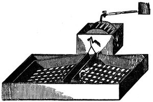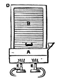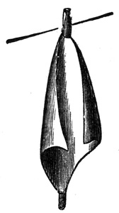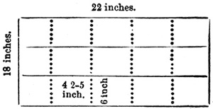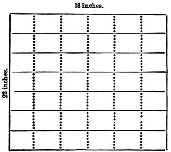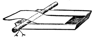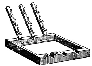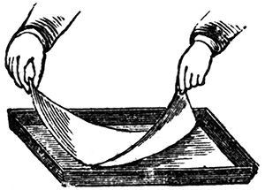 11 Two large dishes are usually employed, and by the time the second sheet is floated in the second dish, the first sheet of paper is ready for removal from the first dish. The sheets, when slowly removed from the bath, are allowed to drain a few seconds, and then thrown over wooden rods of some two inches in diameter, which are removed to a rack, and placed near a trough to collect the drainings.[8] When drained sufficiently the rods are removed to other racks, and the paper allowed to dry spontaneously.