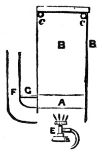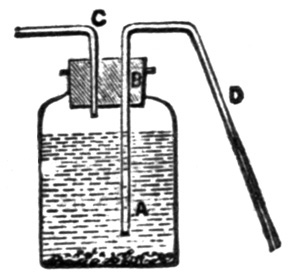 Experience tells us, however strong we may make the bath solution to coagulate the albumen on the paper, that a certain amount of organic matter will always be carried into it. At first this is not apparent, since it remains colourless in the solution; but after a time, after floating a few sheets of paper, the organic silver compound gradually decomposes, and the solution becomes of a brown or red tint, and if paper were floated on it in this condition there would be a dark surface and uneven sensitizing. It is, therefore, necessary to indicate the various means that may be employed to get rid of this impurity. The earliest, if not one of the best, is by the addition of white China clay, which is known in commerce as kaolin. A teaspoonful is placed in the bottle containing the solution, and well shaken up; the organic matter adheres to it, and precipitates to the bottom, and the liquid can be filtered through filter-paper or washed cotton-wool, when it will be found decolourized. Another mode of getting the liquid out of the bottle is to syphon it off by any syphon arrangement, and this prevents a waste in the solution from the absorption of the filtering medium. The accompanying arrangement (fig. 4) will be found useful for the purpose, and can21 be applied to other solutions where decantation is necessary. A is a wide-mouthed bottle holding the solution. B is a cork fitting the mouth, in which two holes have been bored to fit the two tubes, D and C, which are bent to the form shown. When the kaolin has subsided to the bottom, air is forced by the mouth into the bottle through C, the liquid rises over the bend of the tube D, and syphons off to the level of the bottom of the tube inserted into the liquid, provided the end of D, outside the bottle, comes below it.