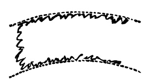 Supposing a whole sheet is to be coated, it will be found more convenient to take the sheet by the corners of one end, one in each hand, and to lower the surface near the end of the dish, and gradually draw the paper over the side of the dish till the whole surface is flat. Bubbles can be got rid of as shown above.