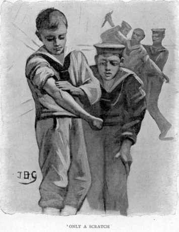 “Lor’, Tom, that wer’ a nipper, that wer’!” he cried, with a grin on his face, as if the wound were rather a joke than otherwise. “But I’m jiggered if I don’t pay out the joker who skewered me then!”
