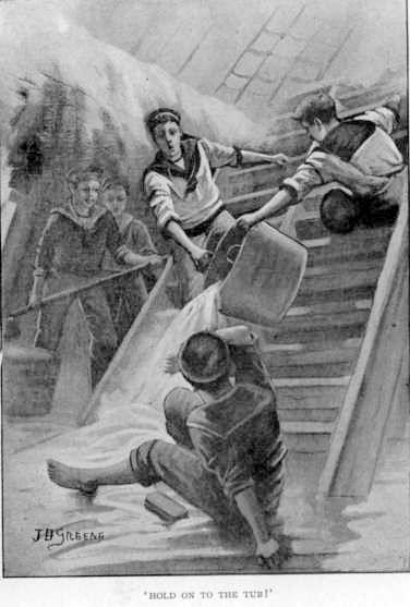 “Forward, men—forward!” he yelled out spasmodically, as he hobbled on like the wind in front, taking long hops at intervals over any obstruction that lay in his path. “Mermaids to the front! You’re not going to let us be licked, men, by any other ship on the station!”