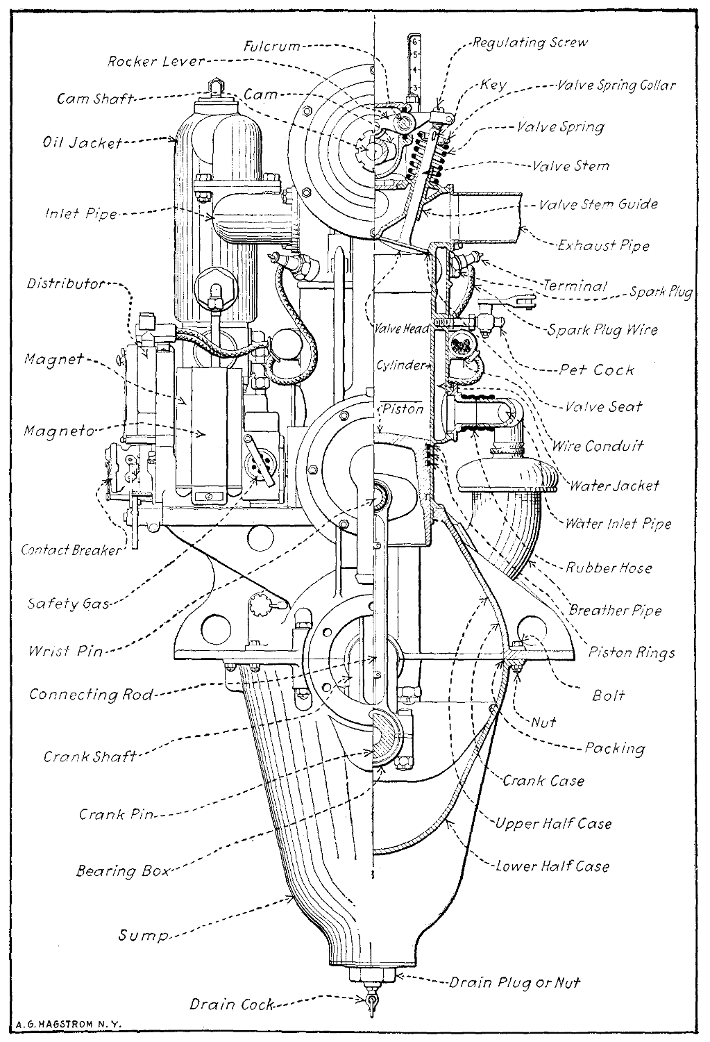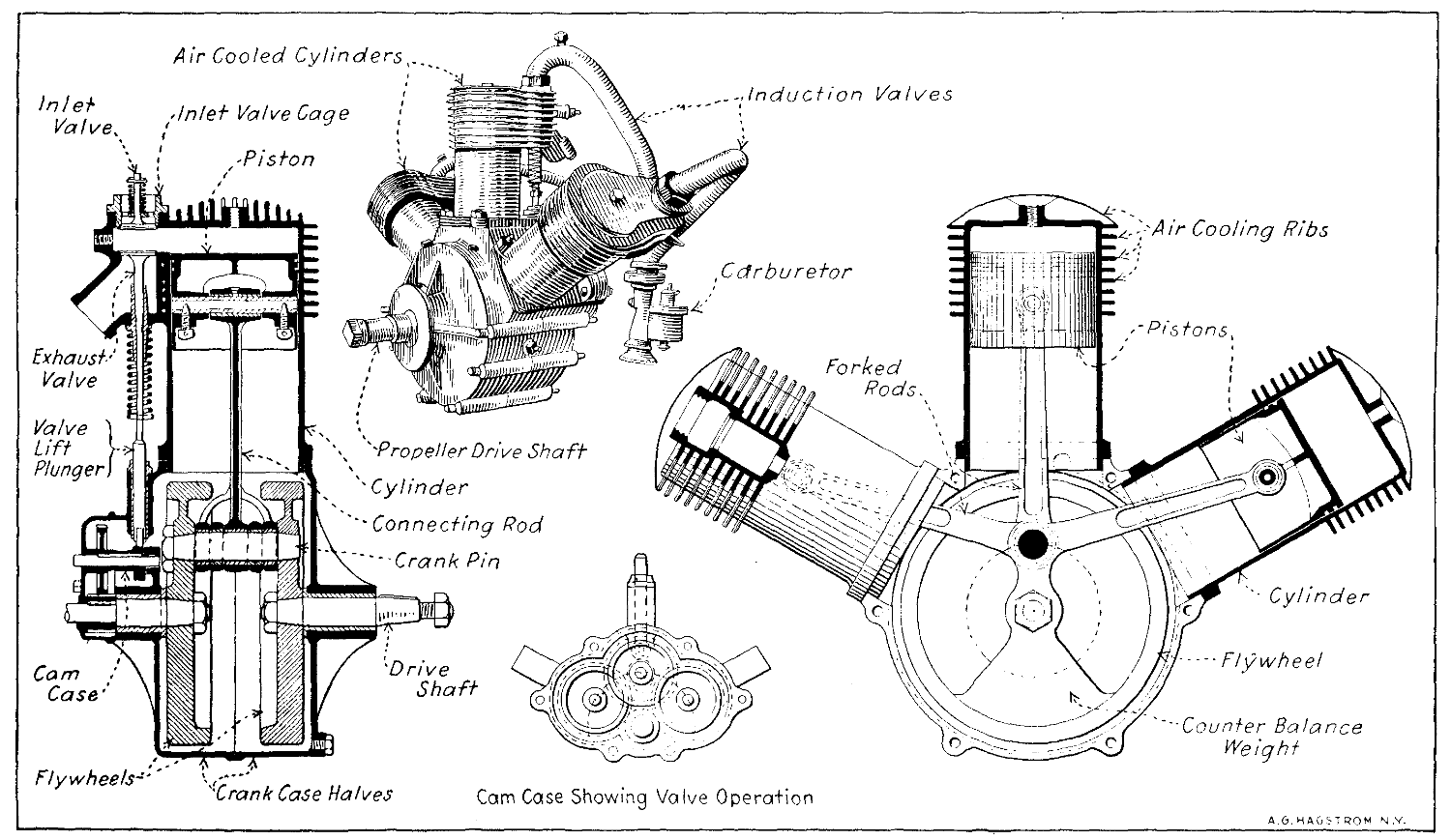 In presenting this treatise on “Aviation Engines,” the writer realizes that the rapidly developing art makes it difficult to outline all latest forms or describe all current engineering practice. This exposition has been prepared primarily for instruction purposes and is adapted for men in the Aviation Section, Signal Corps, and students who wish to become aviators or aviation mechanicians. Every effort has been made to have the engineering information accurate, but owing to the diversity of authorities consulted and use of data translated from foreign language periodicals, it is expected that some slight errors will be present. The writer wishes to acknowledge his indebtedness to such firms as the Curtiss Aeroplane and Motor Co., Hall-Scott Company, Thomas-Morse Aircraft Corporation and General Vehicle Company for photographs and helpful descriptive matter. Special attention has been paid to instructions on tool equipment, use of tools, trouble “shooting” and engine repairs, as it is on these points that the average aviation student is weakest. Only such theoretical consideration of thermo-dynamics as was deemed absolutely necessary to secure a proper understanding of engine action after consulting several instructors is included, the writer’s efforts having been confined to the preparation of a practical series of instructions that would be of the greatest value to those who need a diversified knowledge of internal-combustion engine operation and repair, and[10] who must acquire it quickly. The engines described and illustrated are all practical forms that have been fitted to airplanes capable of making flights and may be considered fairly representative of the present state of the art.