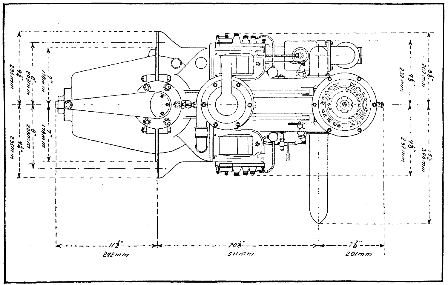 The thrust of the propeller depends on the power of[24] the motor, and on the diameter and pitch of the propeller. If the required thrust to a certain machine is known, the calculation for the horse-power of the motor should be an easy matter.