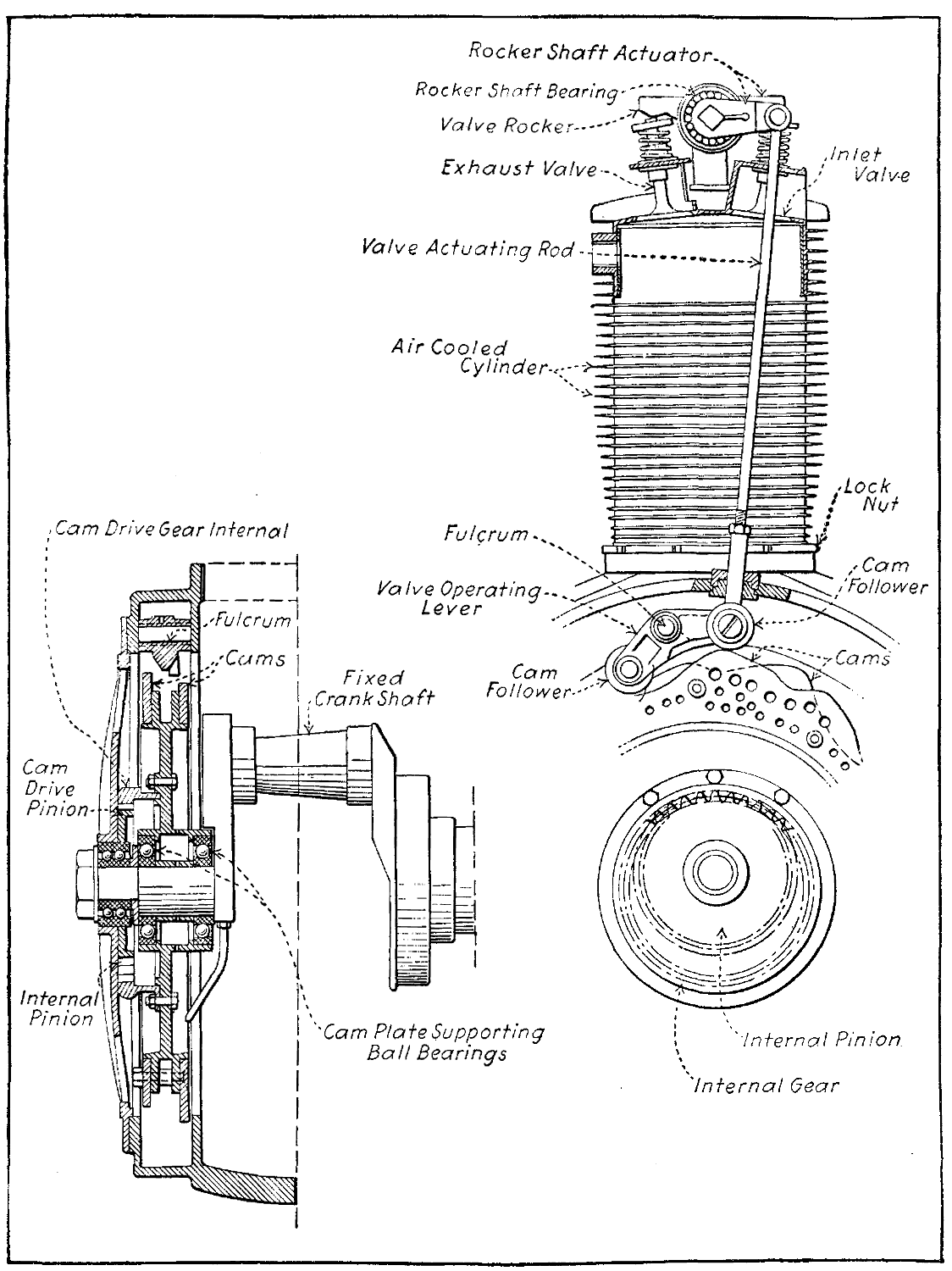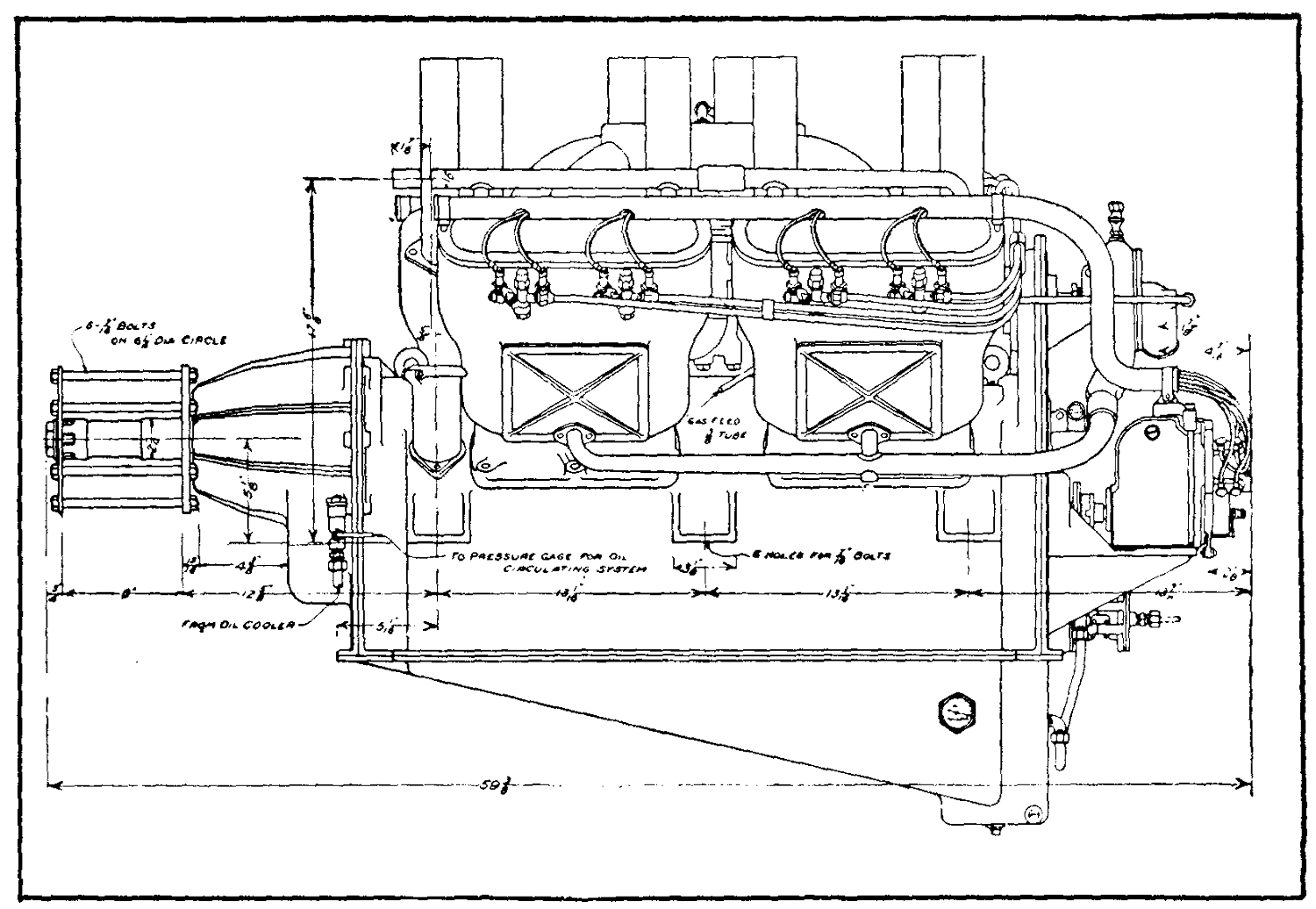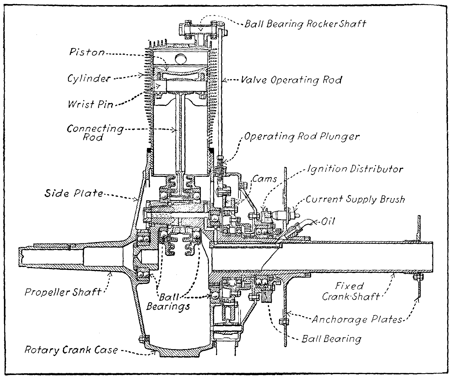 Airship motors, as a rule, must operate constantly at high speeds in order to obtain a maximum power delivery with a minimum piston displacement. In automobiles, or motor boats, motors are not required to run constantly at their maximum speed. Most aircraft motors must function for extended periods at speed as nearly the maximum as possible. Another thing that militates against the aircraft motor is the more or less unsteady foundation to which it is attached. The necessarily light framework of the aeroplane makes it hard for a motor to perform at maximum efficiency on account of the vibration of its foundation while the craft is in flight. Marine and motor car engines, while not placed on foundations as firm as those provided for stationary power plants, are installed on bases of much more stability than the light structure of an aeroplane. The aircraft motor, therefore, must be balanced to a nicety[20] and must run steadily under the most unfavorable conditions.