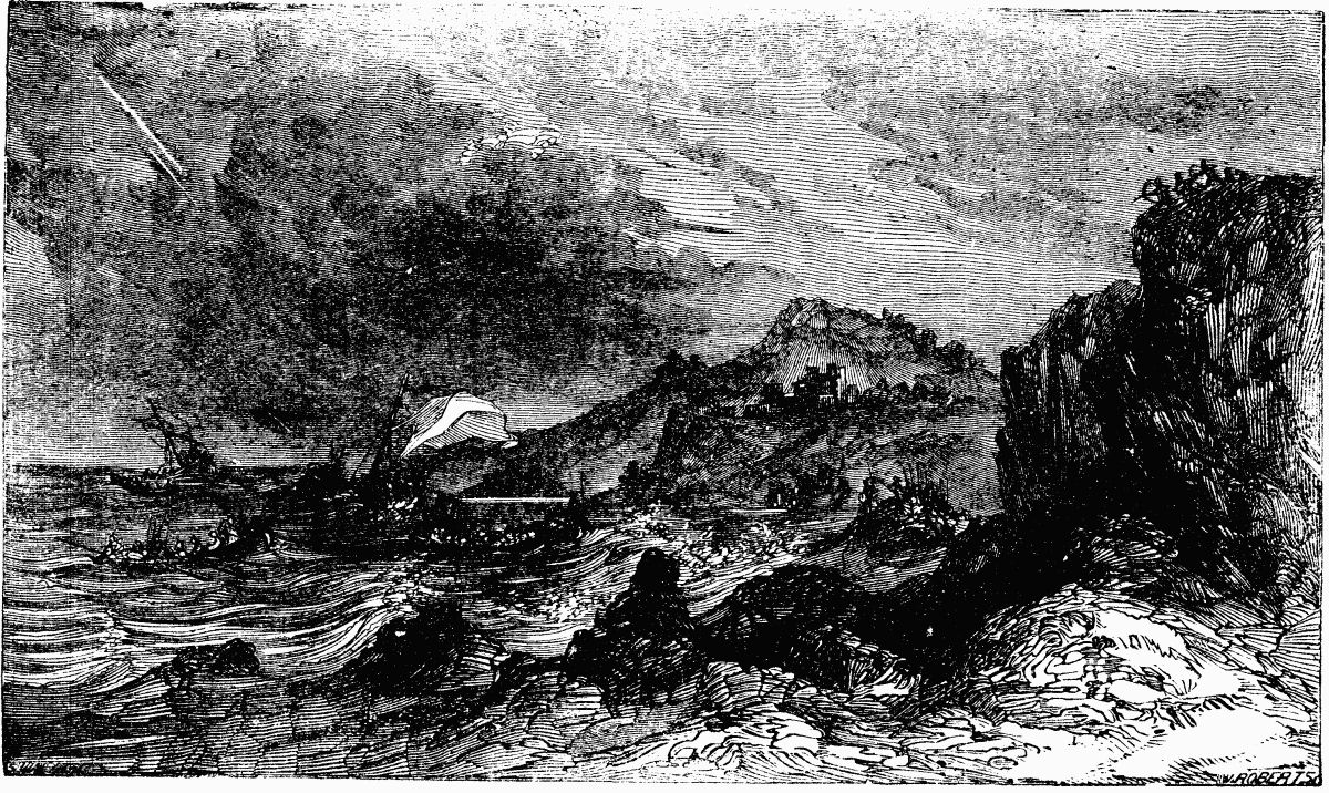 It is scarcely necessary to say that this meant Britain. Brutus, following the directions which [page 18] the oracle had given him, set sail from the island, and proceeded to the westward through the Mediterranean Sea. He arrived at the Pillars of Hercules. This was the name by which the Rock of Gibraltar and the corresponding promontory on the opposite coast, across the straits, were called in those days; these cliffs having been built, according to ancient tales, by Hercules, as monuments set up to mark the extreme limits of his western wanderings. Brutus passed through the strait, and then, turning northward, coasted along the shores of Spain.