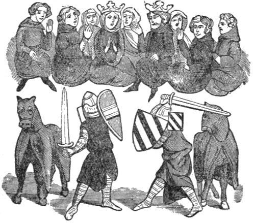 The engraving on the preceding page is a sort of rude emblematic representation of such a trial, copied from a drawing in an ancient manuscript. We see the combatants in the foreground, with the judges and spectators behind.