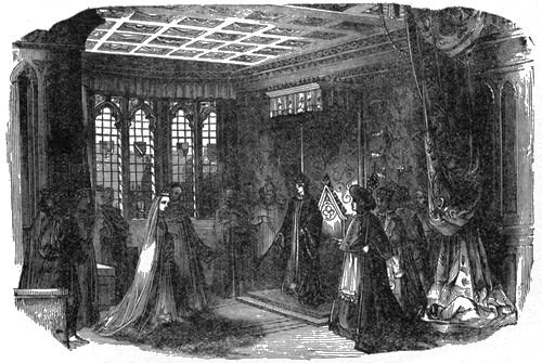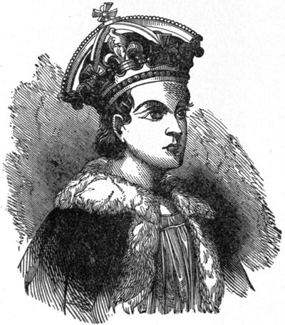 Coronation of the young king in France.When King Henry was old enough to be crowned, in addition to the English part of the ceremony, he went to France to receive the (p. 052) crown of that country too. The ceremony, as is usual with the French kings, was performed at the town of St. Denis, near Paris, where is an ancient royal chapel, in which all the great religious ceremonies connected with the French monarchy have been performed. A very curious account is given by the ancient chroniclers of the pageants and ceremonies which were enacted on this occasion. The king proceeded into France and journeyed to St. Denis at the head of a grand cavalcade of knights, nobles, and men-at-arms, amounting to many thousand men, all of whom were adorned with dresses and trappings of the most gorgeous description. At St. Denis the authorities came out to meet the king, dressed in robes of vermilion, and bearing splendid banners. The king was presented, as he passed through the gates, "with three crimson hearts, in one of which were two doves; in another, several small birds, which were let fly over his head; while the third was filled with violets and flowers, which were thrown over the lords that attended and followed him."