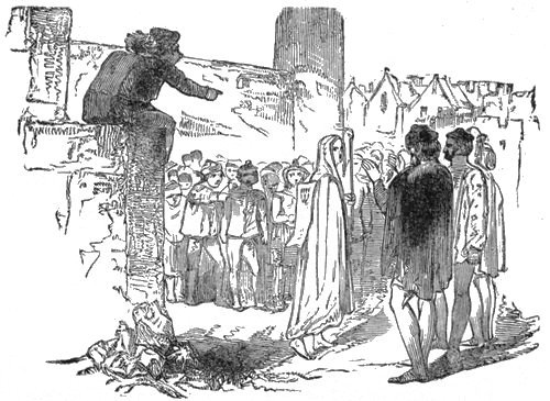 The company assemble. The combatants appear.At the place where the combat was to be (p. 039) fought a large space was railed in by a very substantial barricade. The barricade was made very strong, so as to resist the utmost possible pressure of the crowd. Elevated seats, commanding a full view of the lists, as the area railed in was called, were erected for the use of the king and the nobles of the court, and all other necessary preparations were made. When the hour arrived on the appointed day, the king and the nobles came in great state and took their places. The whole square, with the exception of the lists and proper avenues of approach, which were kept open by the men-at-arms, had long since been filled with an immense crowd of people from the surrounding country. At length, after a brief period of expectation, the challenger, Anneslie, was seen coming along one of the approaches, mounted on a horse splendidly caparisoned, and attended by several knights and squires, his friends, all completely armed.