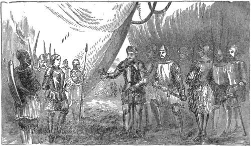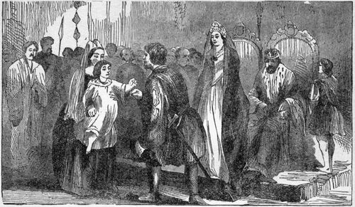 When Edward, accompanied by his officers and the nobles in attendance upon him, covered with the blood and the dust of the conflict, and fierce and exultant under the excitement (p. 303) of slaughter and victory, came into the tent, and saw the handsome young prince standing there in the hands of his captors, he was at first struck with the elegance of his appearance and his frank and manly bearing. He, however, accosted him fiercely by demanding what brought him to England. The prince replied fearlessly that he came to recover his father's crown and his own inheritance. Upon this, Edward threw his glove, a heavy iron gauntlet, in his face.