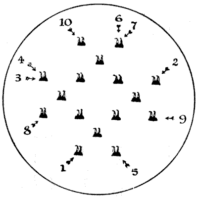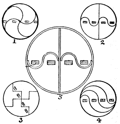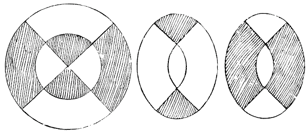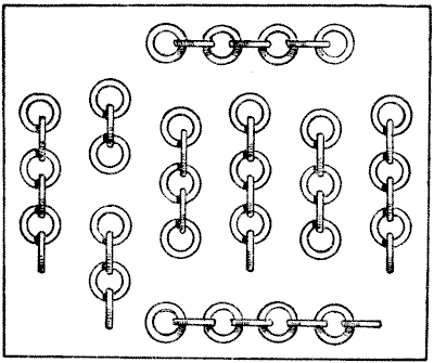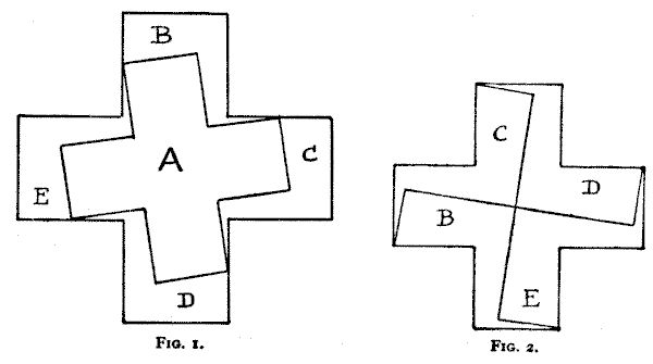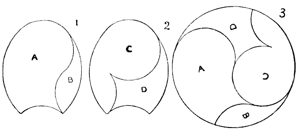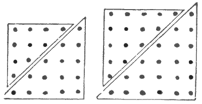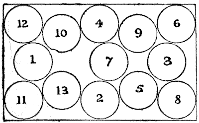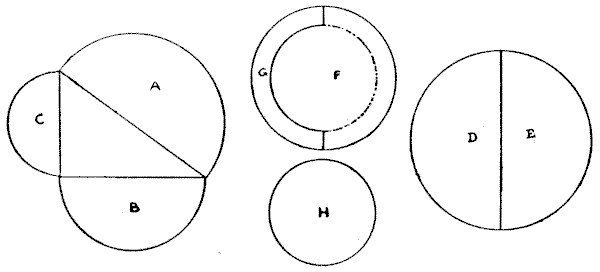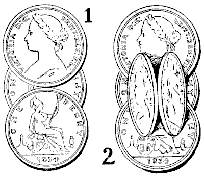 Our observation of little things is frequently defective, and our memories very liable to lapse. A certain judge recently remarked in a case that he had no recollection whatever of putting the wedding-ring on his wife's finger. Can you correctly answer these questions without having the coins in sight? On which side of a penny is the date given? Some people are so unobservant that, although they are handling the coin nearly every day of their lives, they are at a loss to answer this simple question. If I lay a penny flat on the table, how many other pennies can I place around it, every one also lying flat on the table, so that they all touch the first one? The geometrician will, of course, give the answer at once, and not need to make any experiment. Pg 5He will also know that, since all circles are similar, the same answer will necessarily apply to any coin. The next question is a most interesting one to ask a company, each person writing down his answer on a slip of paper, so that no one shall be helped by the answers of others. What is the greatest number of three-penny-pieces that may be laid flat on the surface of a half-crown, so that no piece lies on another or overlaps the surface of the half-crown? It is amazing what a variety of different answers one gets to this question. Very few people will be found to give the correct number. Of course the answer must be given without looking at the coins.
