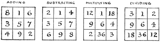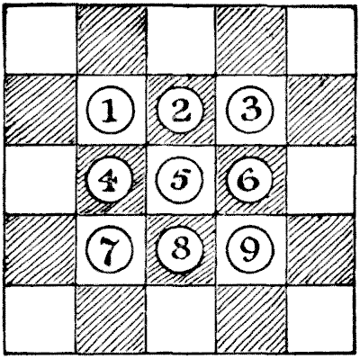Every one is familiar with the difficulties that frequently arise over the giving of change, and how the assistance of a third person with a few coins in his pocket will sometimes help us to set the matter right. Here is an example. An Englishman went into a shop in New York and bought goods at a cost of thirty-four cents. The only money he had was a dollar, a three-cent piece, and a two-cent piece. The tradesman had only a half-dollar and a quarter-dollar. But another customer happened to be present, and when asked to help produced two dimes, a five-cent piece, a two-cent piece, and a one-cent piece. How did the tradesman manage to give change? For the benefit of those readers who are not familiar with the American coinage, it is only necessary to say that a dollar is a hundred cents and a dime ten cents. A puzzle of this kind should rarely cause any difficulty if attacked in a proper manner.