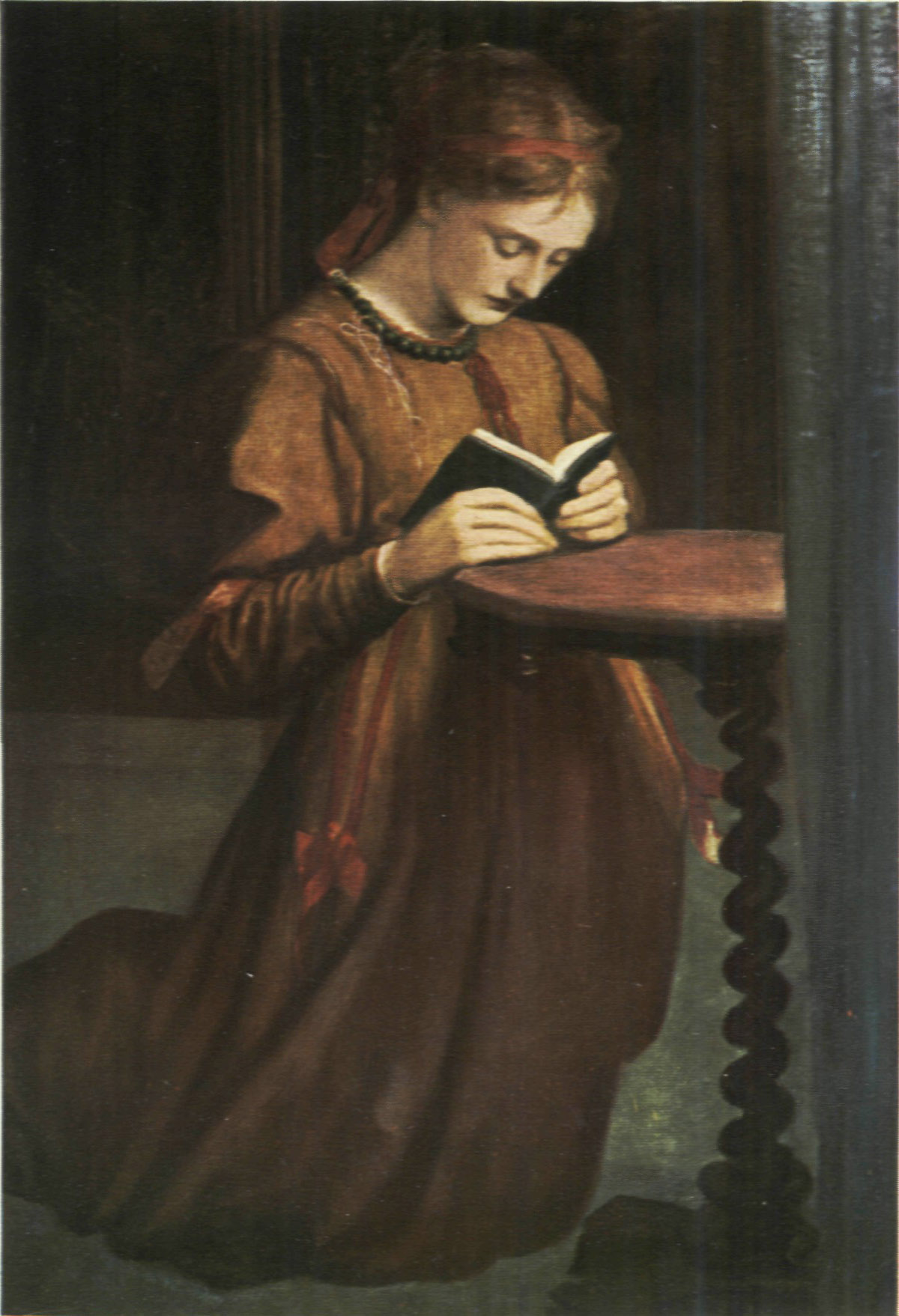 This is one of the most simple and beautiful of Watts' early works. The young woman is kneeling at the table, book in hand, her mind absorbed in thoughts of reverence. Painted in 1860.