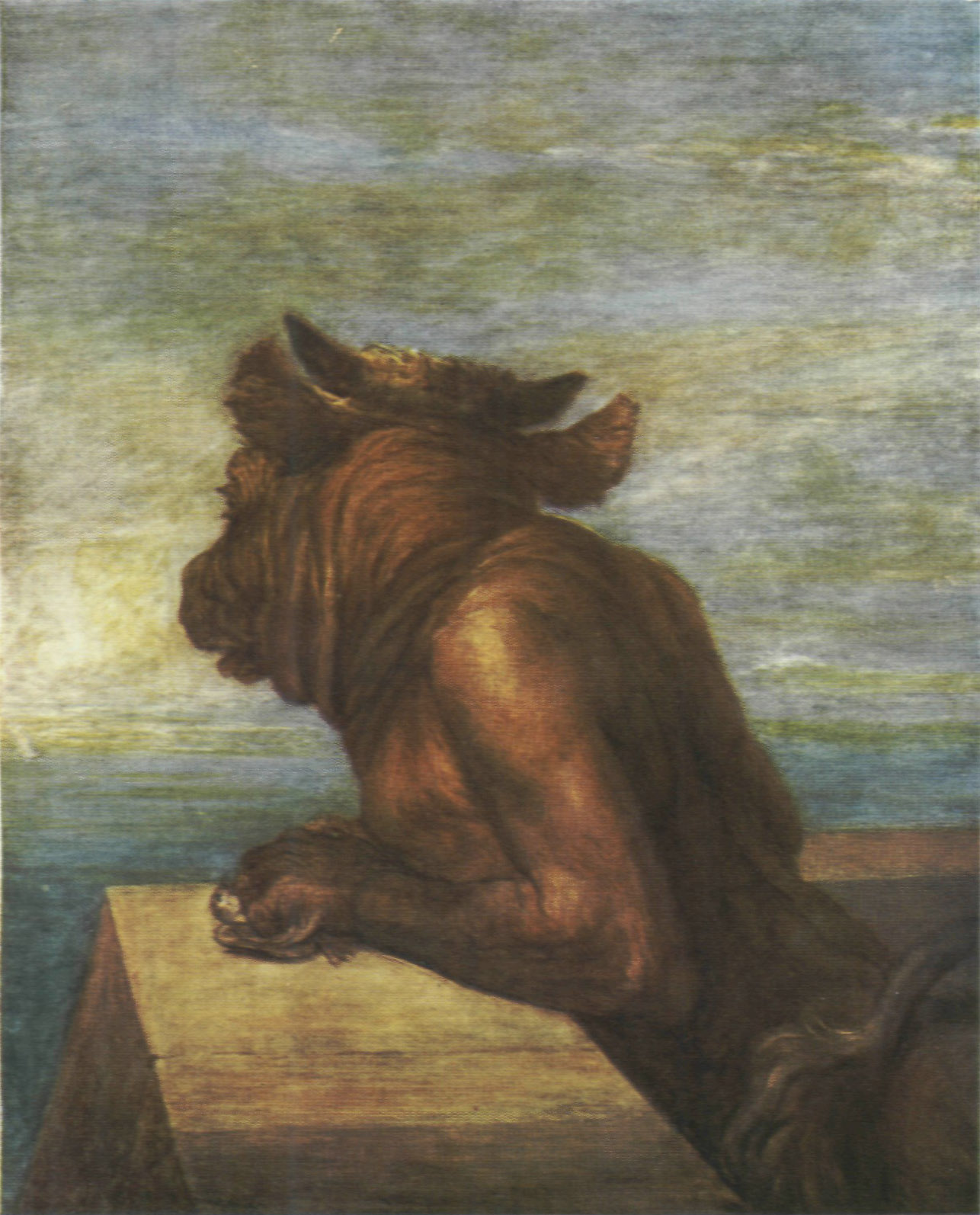In this terrible figure, half man, half bull, gazing over the sea from the battlement of a hill tower, we see the artist's representation of the greed and lust associated with modern civilisations. The picture was exhibited at the Winter Exhibition of the New Gallery, 1896, and formed part of the Watts Gift in 1897. It hangs in the Watts Room at the Tate Gallery.