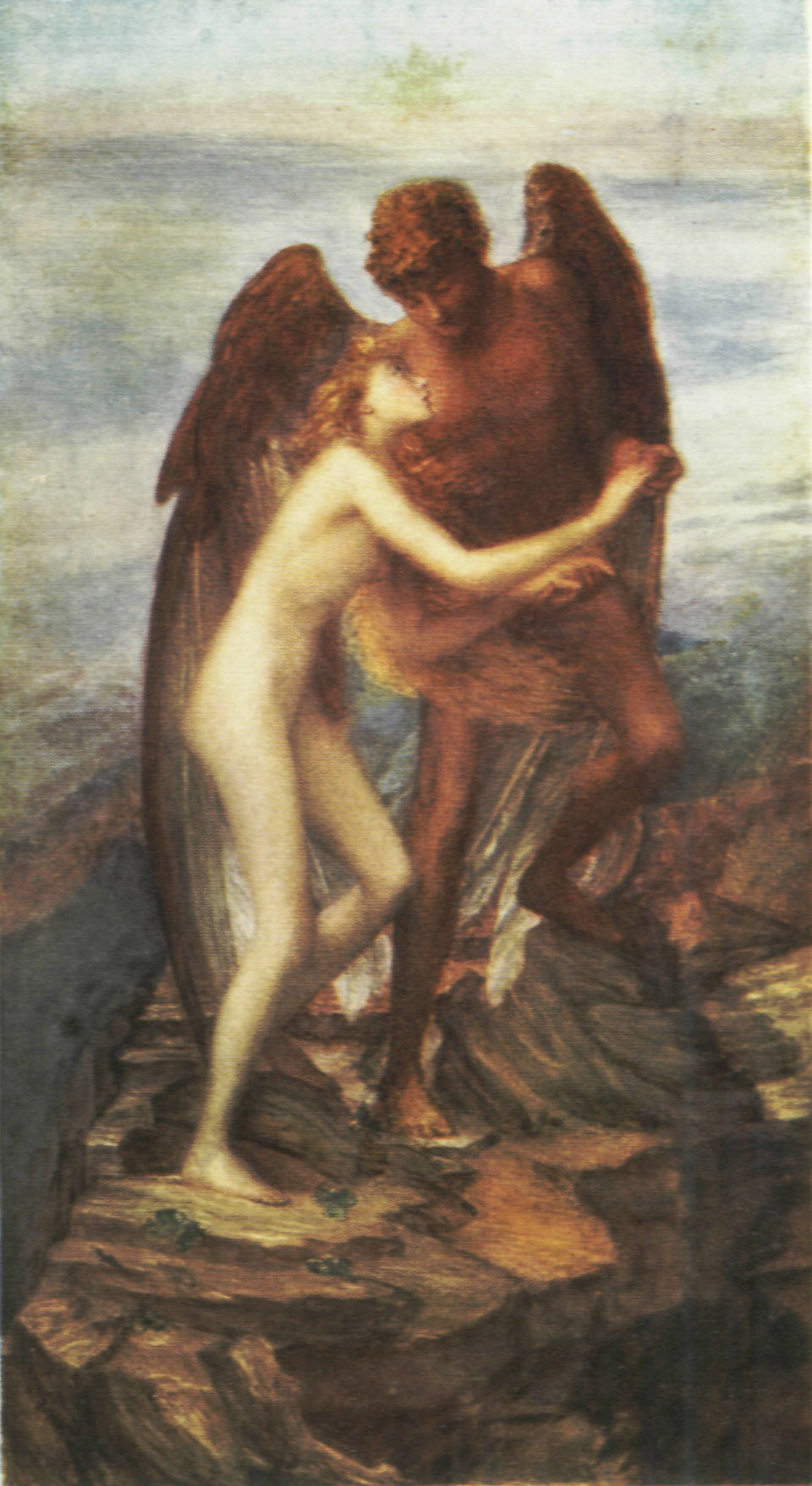 Love, strong in his immortal youth, leads Life, a slight female figure, along the steep uphill path; with his broad wings he shelters her, that the winds of heaven may not visit her too roughly. Violets spring where Love has trod, and as they ascend to the mountain top the air becomes more and more golden. The implication is that, without the aid of Divine Love, fragile Human Life could not have power to ascend the steep path upward. First exhibited at the Grosvenor Gallery in 1885. Companion picture to "Love and Death," and "Love Triumphant."
