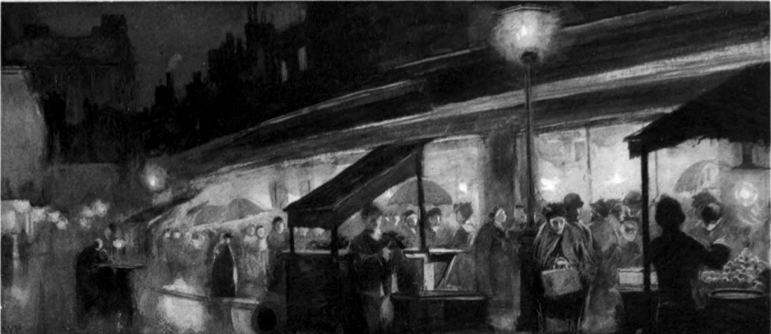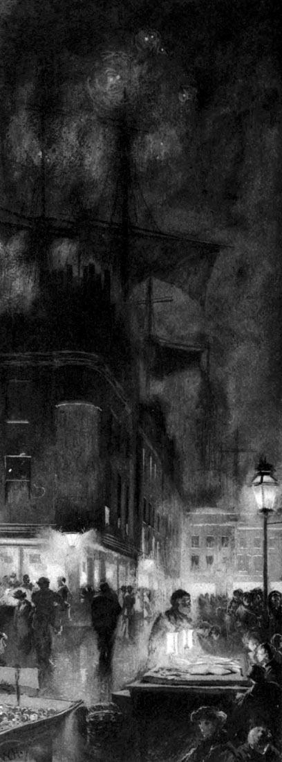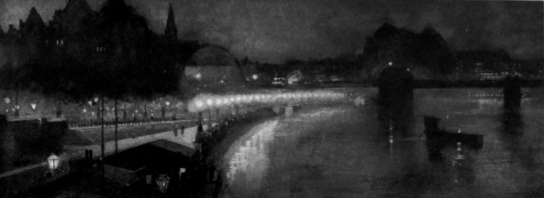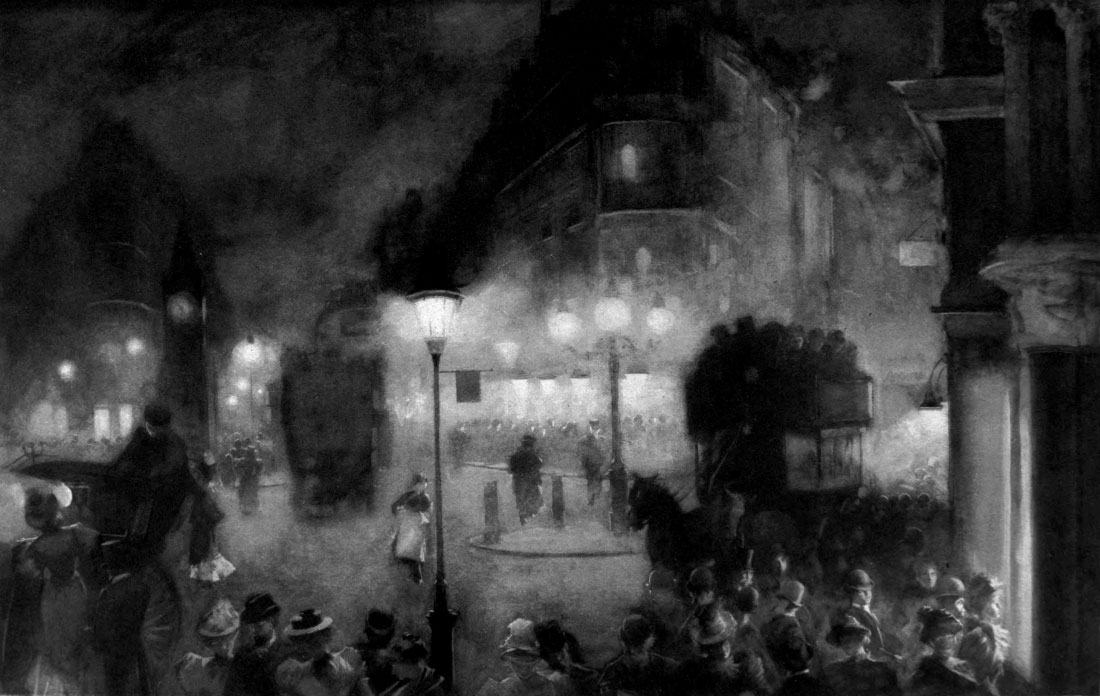 London at night has begun, of late, so to multiply her lights that they make all her scenery. A search-light suddenly draws the eye up to the chimney-pots (sweetly touched, they too, on the westernmost of their squalid sides) and to the unbroken sky; and then at once the eye travels down its shaft, revealing clouded air; and here a puff of steam from some machine at work on the new underground railway takes colour on its curves. Or the search-light makes the programme of a music-hall to shine black and white upon the wall; anon, an advertisement is written in light, [Pg 15]and perpetually among the even progress of the carriage lights flit the lamps of bicycles. And if, from a heart of glowing lights, you look into the streets, you find them so filled with blue air that there is evident blue between you and the houses opposite.