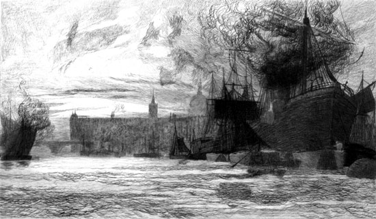The waters of the Thames could hardly quench so great a multitude of imprisoned flames. Fire is the secret of the Thames itself, lurking as it does in the ships and boats; the black barges are charged to feed it, and the airs that wander with the river fan it to its perpetual work. It is trained within its little shrines, and leaps in chains and captivity, and runs in narrow courses. With its cold ashes and its cold grime, with the burden of its chill refuse, all the remote roads and byways of the town seem to be utterly choked and filled.
