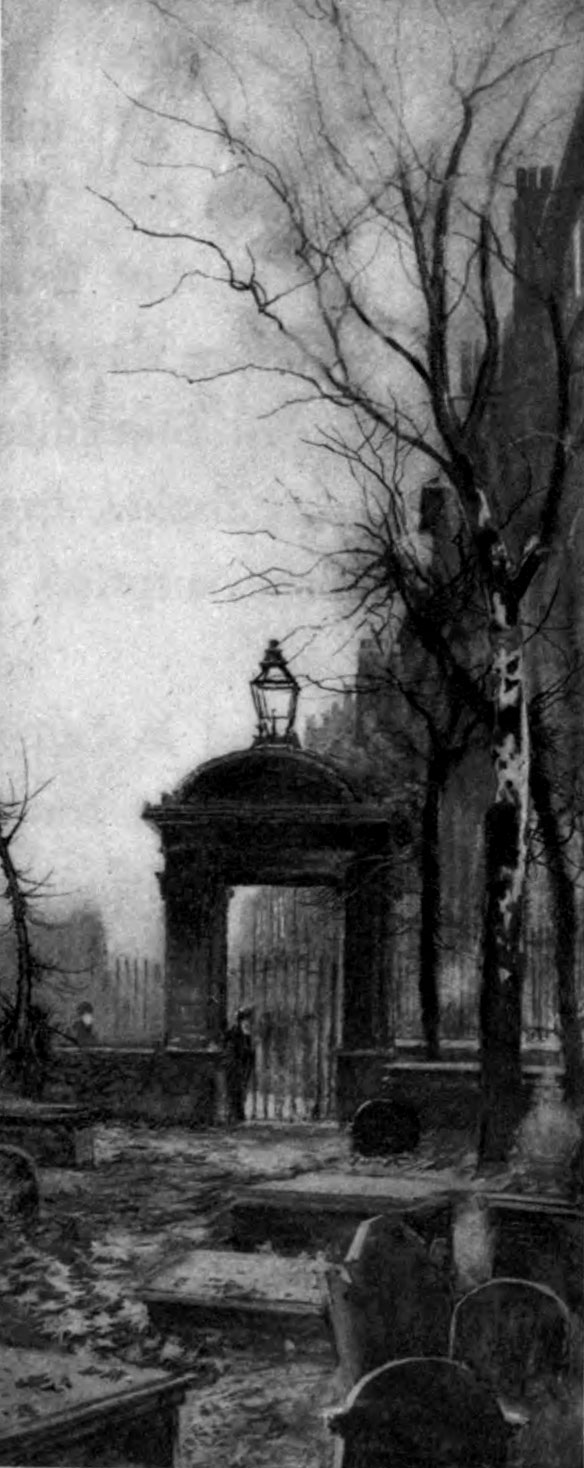 Another surprise is that you fall in love with the City steeples, and find it dull to pass out of their influence of serenity and fancy to come amongst the Gothic towers and spires of the suburbs. These last are studious and consistent, properly retrospective, and full of principle and history. Moreover, they are well seen, for they stand in the wide dwarf town, with nothing of their own measure except the Board Schools. All the shabbier suburbs are dwarfs, and none drop so suddenly and go so near the ground as the suburbs of the north-east. But there are too many Gothic towers; whereas of the lovely spires of Wren and of his followers we shall have no more. No one, it seems, plots to recapture that signal inspiration, so delicate, so inventive, so full of dignity and freaks. Nothing is quite so beautiful as the spire of Bow, but it must be permitted to admire a slender steeple in Shoreditch, and one close to the Blue-Coat [Pg 3]School, the much less ingenious one by the Post Office, even the prankish one near the Mansion House, besides the beautiful St. Mary’s in the Strand, and the only less charming St. Clement Danes. And all these lily-like spires have kept, more or less, their paleness in the smirched and spotted town. They are fine against all the London skies, and never more beautiful than with a bright grey sky, and the half-sunshine of a characteristic London day on their happy little cupolas and small and exquisite columns, except, perhaps, when a westering sun makes their white a golden rose. St. Botolph’s, Bishopsgate, has but a squat spire, set with flourishing little urns; but it has many trees tossing in the summer wind, and in its garden a fountain where the pigeons and sparrows bathe together. Across the geraniums and lobelias of another quadrangle, full of sun and translucent shadow, you may see the gold of the altar-lights, and white surplices gilded with that gold. The tradition—a Dickens tradition, it seems—of the desolate City church is still true as to the numbers of the congregations: in this open church there are but three people, exceedingly devout; but the old woman, the beadle, the gloom are gone.