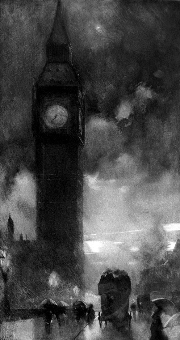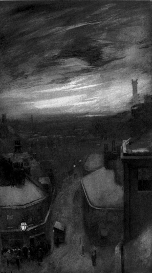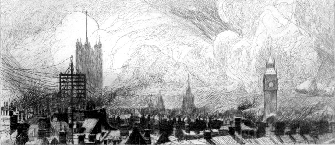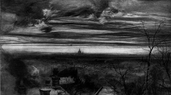 There is another effect of the London climate, besides the effect of sky scenery, and that is the local colour wherewith the characteristic smoke, mingled with a little rain to make a general water-colour, has painted the surfaces of the town in variants of black. The citizen who—unaware of such things as the quarter of the wind—takes his umbrella for fear of the thunderous look of a tremendous smoke-storm to leeward, is apt to take the touch of soot for the touch of time. Nevertheless, the two dark colours are quite unlike; time is browner, and has a depth in the tone, whereas soot is greyer, and at its blackest has no depth. It gives a shallow colour; and even those who love their sky streaked and tumbled into the chaos of smoke should not be allowed to defend the aquarelle that colours their buildings.