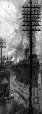 In spite of the length of London, you may pass from the furthest west to the extreme east, and from the last country field to the first, so quickly as to get a continuous Sunday impression—the day and the people flowing, unfolding, and closing, from suburb to remote suburb, through ‘town,’ through the City, through the east, and to the verge of breathless and unfragrant meadows, divided by a league-long tramway line lost in the distances of Epping, whither the smoke, from which a south-west wind has set all London radiantly free, is trailing a broken wing.