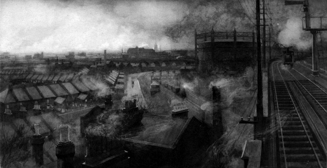 And yet the artificial climate of London is at its best when it is very obvious, and when it has strong scenes of sunset or storm to deal with. The time when it is insufferable is noonday or full afternoon on a cloudless day in summer, when there is not wind enough to drift it, helpless, out of town, and when it is not thick enough to keep the sun away. It makes the sunshine ugly. No beauty, even artificial or obvious, belongs to the smoke then, and it plays no antic pranks in mimicry of cloud. It has no shadow and no menace; it has no opportunity for stage-plays; it is disconcerted, and cannot make a penny theatre of its London. Every one must know such days, of which the essence should have been their purity, plain and splendid. By their light is the smoke seen to be nothing in the world but a sorry smirch. The horizon is thickened with it, and there it wreaks its chief ‘effects,’ but all near things are also oppressed by it; the spirit of the sunshine is gone, and a blazing sun upon miles of blue slate roofs and yellow houses, with the thin uncleanness of smoke just showing in the blaze, is actually that impossibility—sunshine without beauty.
